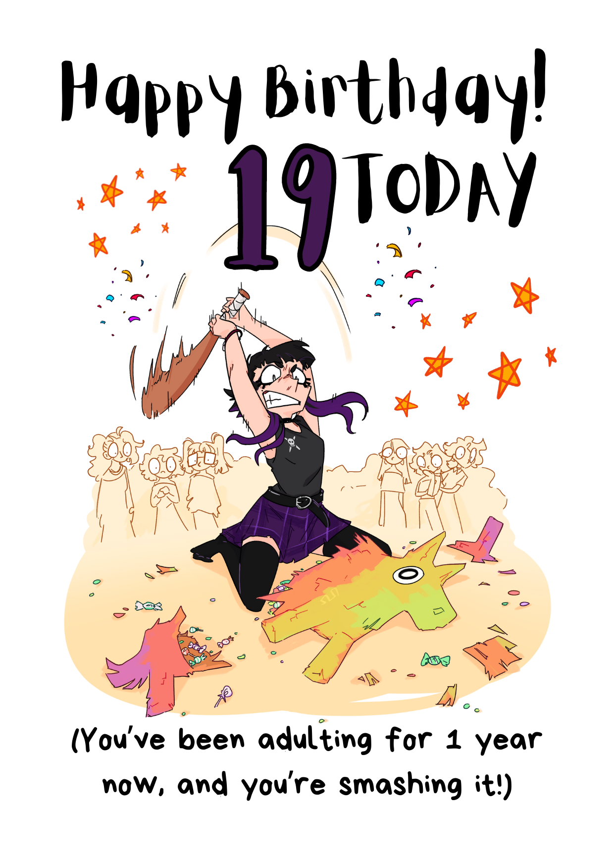 This unique birthday card is perfect for the 19 Year Old Goth Girl in your life - Friend or Female Relative. It features a girl in grunge, gothic dress smashing a pinata and features the wording "Happy Birthday 19 Today. You've been adulting for 1 year now and you're smashing it!"